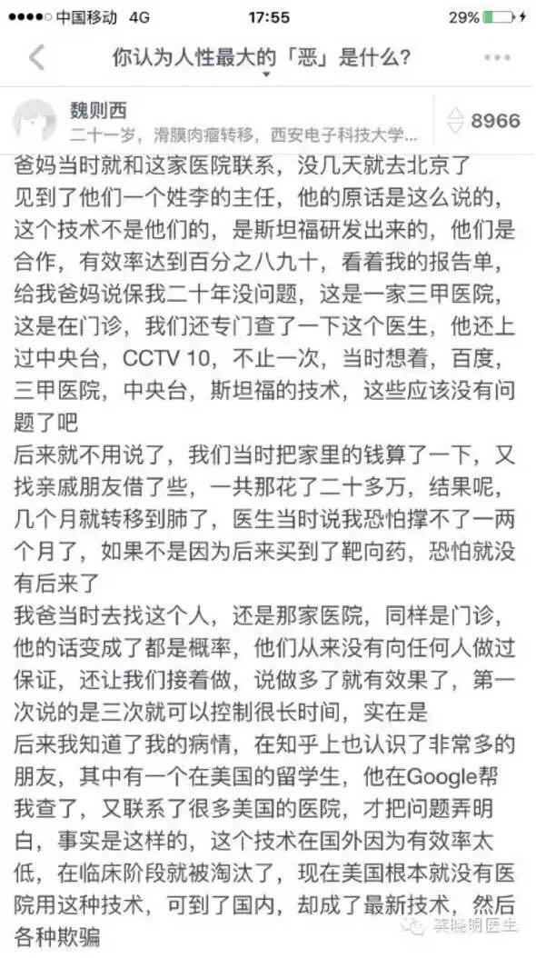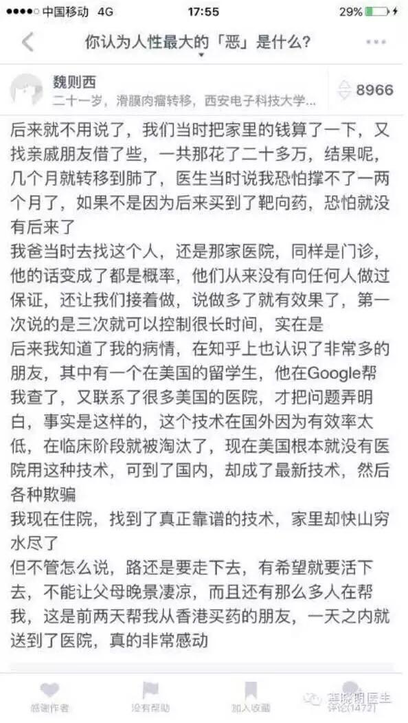 你认为人性大的“恶”是什么?在知乎的这个问题下,患上滑膜肉瘤的大学生魏则西曾给出了上述答案。
