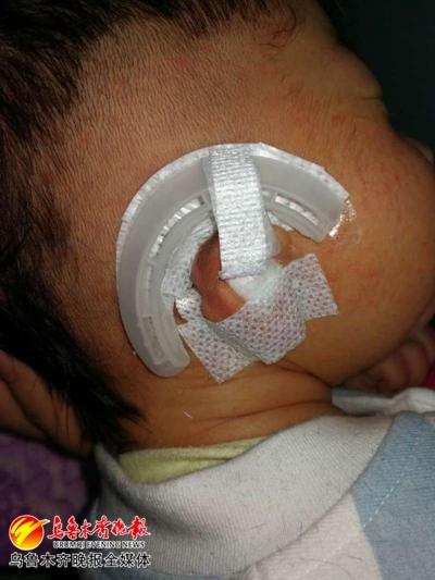 当天,记者在新疆军区总医院耳鼻咽喉头颈外科看到,出生仅24天的乐乐右耳外耳廓向内卷曲,用手轻轻拨开外耳廓,其形态则恢复正常,但大小只有左耳的五分之三。