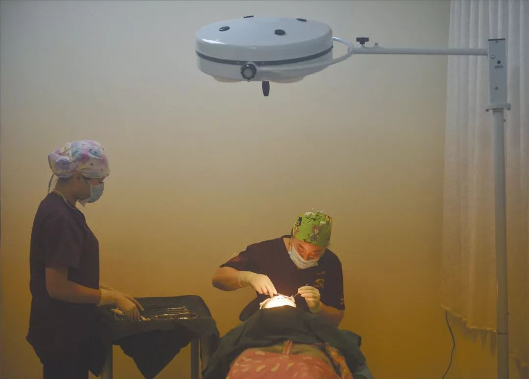 在她身边,医生正对着她的鼻梁做后的缝合包扎。出手术室后,这个90后姑娘即将告别塌鼻梁的岁月。