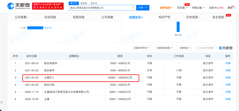 天眼查信息显示,该公司成立于2020年9月,注册资本为30万元,公司法定代表人为黄海宇。根据其在2021年4月发布的招聘信息,该公司旗下的主播艺人月薪高达10万元。