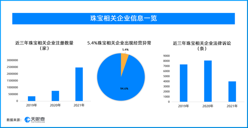 天眼查风险数据显示,从事珠宝相关业务的企业中,1.5%的相关企业曾出现法律诉讼,5.4%的相关企业曾出现经营异常,0.7%的相关企业曾遭到行政处罚。据不完全统计,2021年我国珠宝相关企业共产生了1万余条被执行人信息,30条行政处罚信息,180余条严重违法信息。
