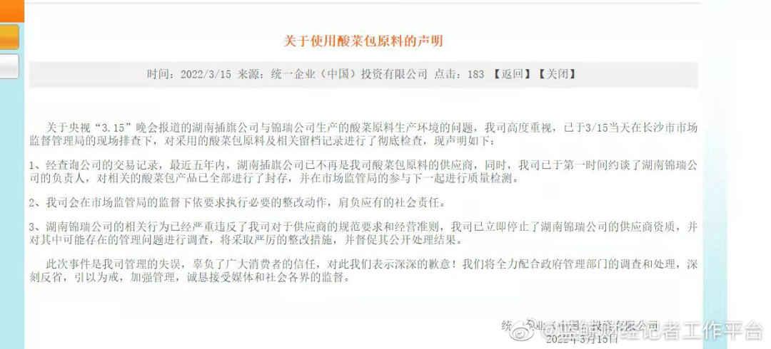 针对插旗菜业被315晚会曝光卫生不达标、制作过程无保障等问题,统一相关负责人表示,近五年内,湖南插旗公司已不再是我司酸菜包原料的供应商,同时,我司已于第一时间约谈了湖南锦瑞公司的负责人,对相关的酸菜包产品已全部进行了封存,并在市场监管局的参与下一起进行质量检测。