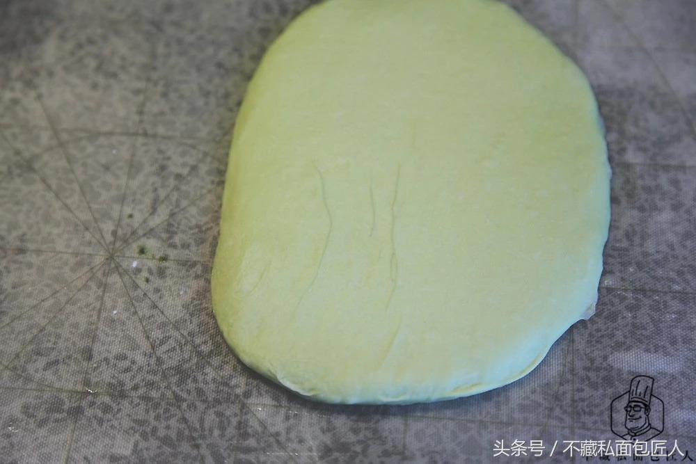 4.留下的面团压平,把抹茶膏抹在面团表面
