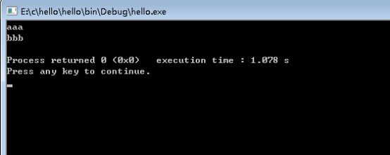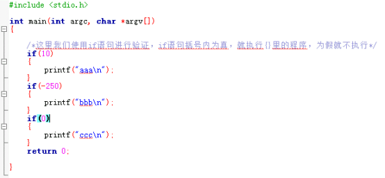 这里使用if语句进行验证,还记得我们之前说的main函数{}作用吗,表示括号的程序属于main()里的,这里{}里的内容属于if()语句的。这段程序写的是,如果10是真,就打印“aaa”;如果-250是真,就打印“bbb”;如果0是真,就打印“ccc”,我们看执行结果: