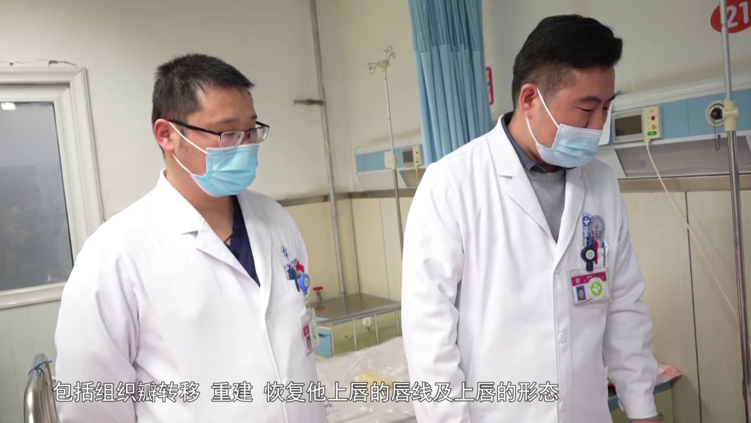 因为当时毁损得比较厉害,整个上唇纵形撕裂,牙龈包括口腔内黏膜粉碎性撕脱,上颌骨外露了,所以当时我们麻醉下给他进行口腔黏膜清创,包括组织瓣转移、重建,恢复他上唇的唇线及上唇的形态,第二,我们用一些皮瓣、黏膜转移的方法,用在毁损、缺损的部位,用其他的黏膜包括周围的黏膜来进行替代,从而来恢复他上唇的形态.