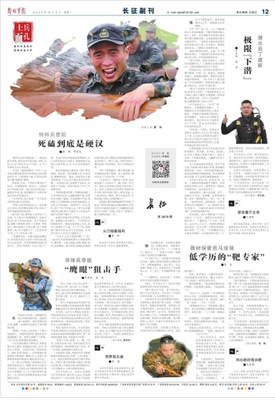 今天的长征副刊版的《士兵面孔》专栏,不仅给您带来了硬汉特种兵曹阳的故事,还有潜水员丁建新、“鹰眼”狙击手李能和低学历的“靶专家”马俊强的故事。请看今日出版的《解放军报》的报道: