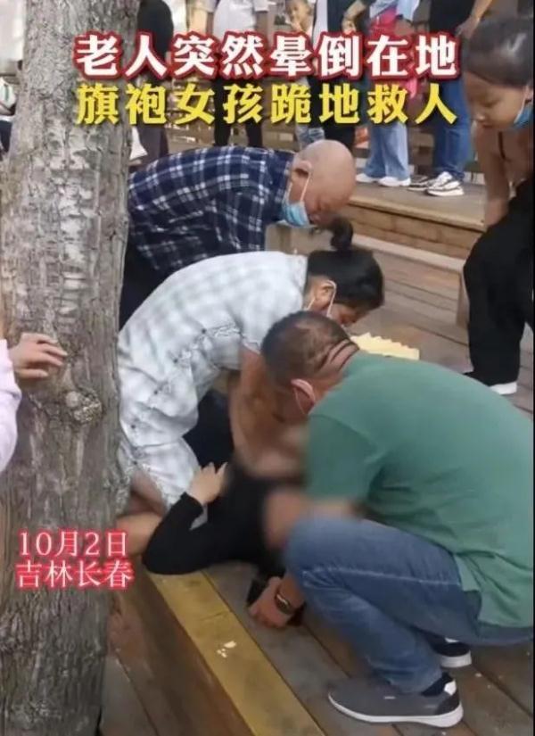 “我当时贴近一看老人面色苍白、牙关紧闭、口唇发紫,并且已失去意识,心脏骤停。我随即询问老人家属得知老人有心脑血管病史,根据10年的心内科护理经验,我判断老人的突然晕倒应为心脏病所致,如果不采取急救措施将会有生命危险!”穿旗袍女子说。