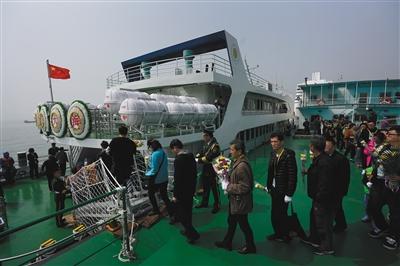 2018年4月2日,天津市滨海新区国际邮轮母港码头,全国首艘骨灰海撒专用船“国宾9号”首航,来自北京的逝者亲属们正排队登船。新京报记者 王飞 摄