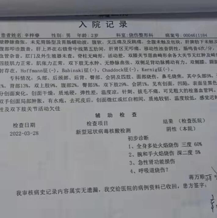 直到医院,辛永山才发现自己的双手在营救小睿时被烧伤。经过检查,小睿身体多处火焰烧伤(三度、60%),腕和手火焰烧伤(深二度、5%),还有急性肾功能损伤等。记者了解到,今年39岁的辛永山老家是临沂市沂水县沙沟镇东于沟村,几年前来即墨区买房安家。尽管家境不富裕,但是他和妻子辛苦工作,努力地撑起了这个小家。2019年,小睿出生后都是夫妻两人轮流照看,妻子休完产假,就到即墨一家电子厂上班,照看小儿子的任务就落到了辛永山的肩上。辛永山平时开货车给人送货,从小睿10个月大时,辛永山就时常带着他一起外出送货时。