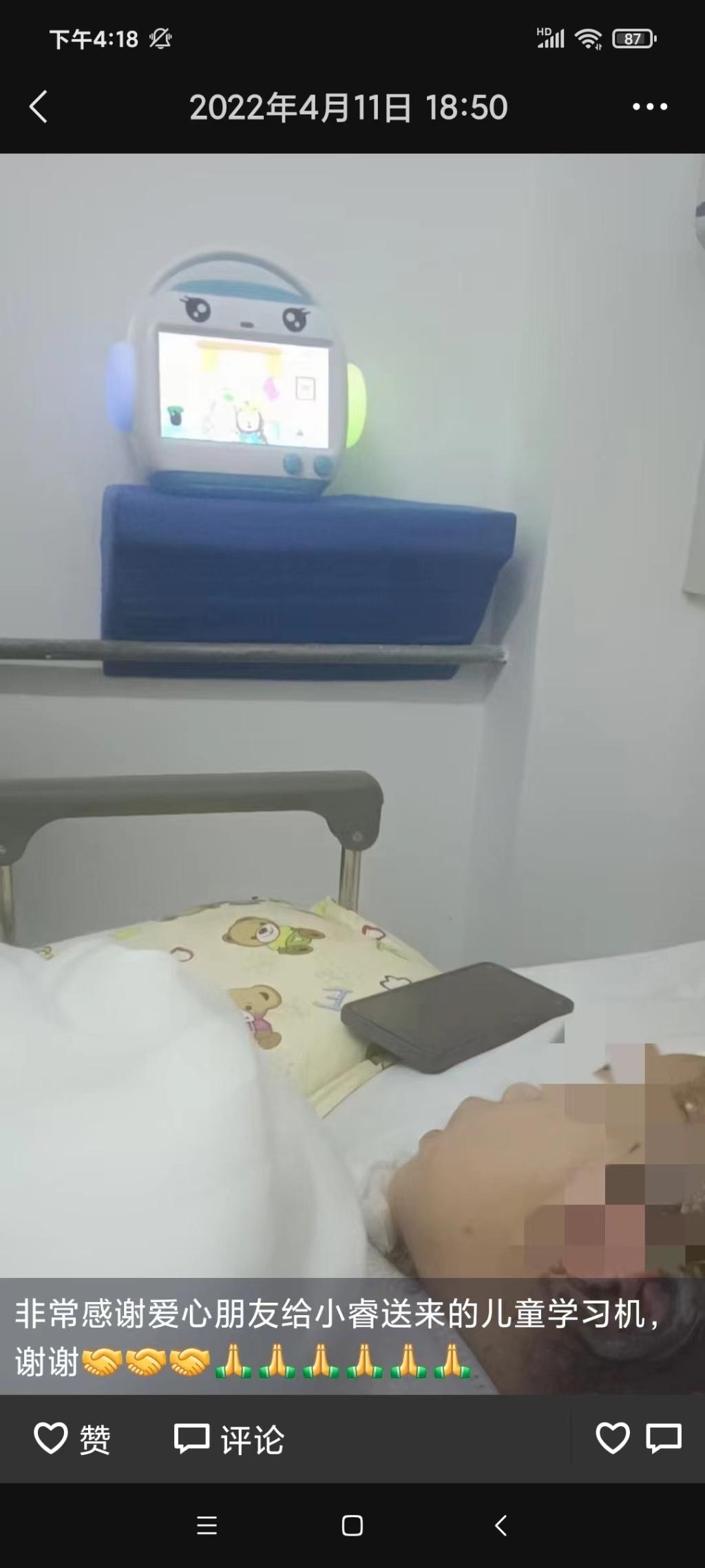 记者采访得知,为了让小睿的住院生活不那么枯燥,有热心小朋友送来了儿童学习机,看到里面的动画视频,小睿脸上的笑容多了起来。还有的小朋友送来了爱心款和玩具。这些,辛永山都记在了自己的微信朋友圈中:“感谢两位小朋友送来的爱心帮助,还给小睿带来的玩具,看到小睿开心的一笑,带给了我们大家的希望,我代表我们全家谢谢你们的爱心帮助。”