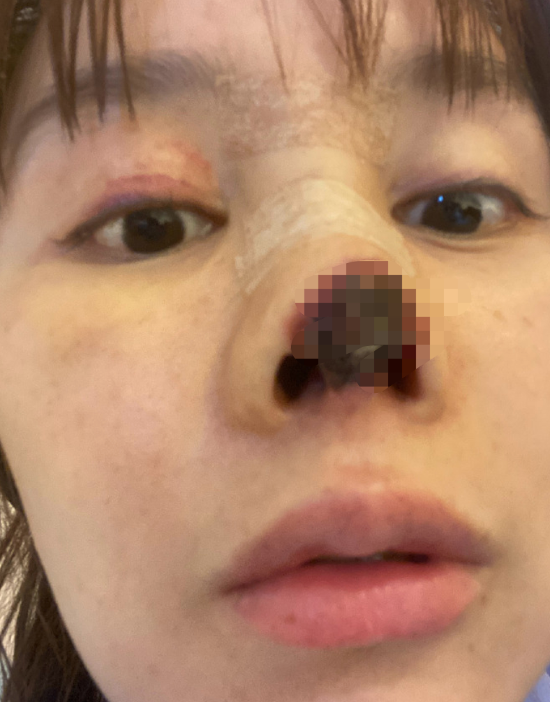 而且在咨询医生后,高溜绝望地发现自己鼻子可能永远无法恢复到以前了,医生说多只能恢复到术前的百分之七八十左右,如今快半年过去,她的鼻尖上还有一个红色的疤。