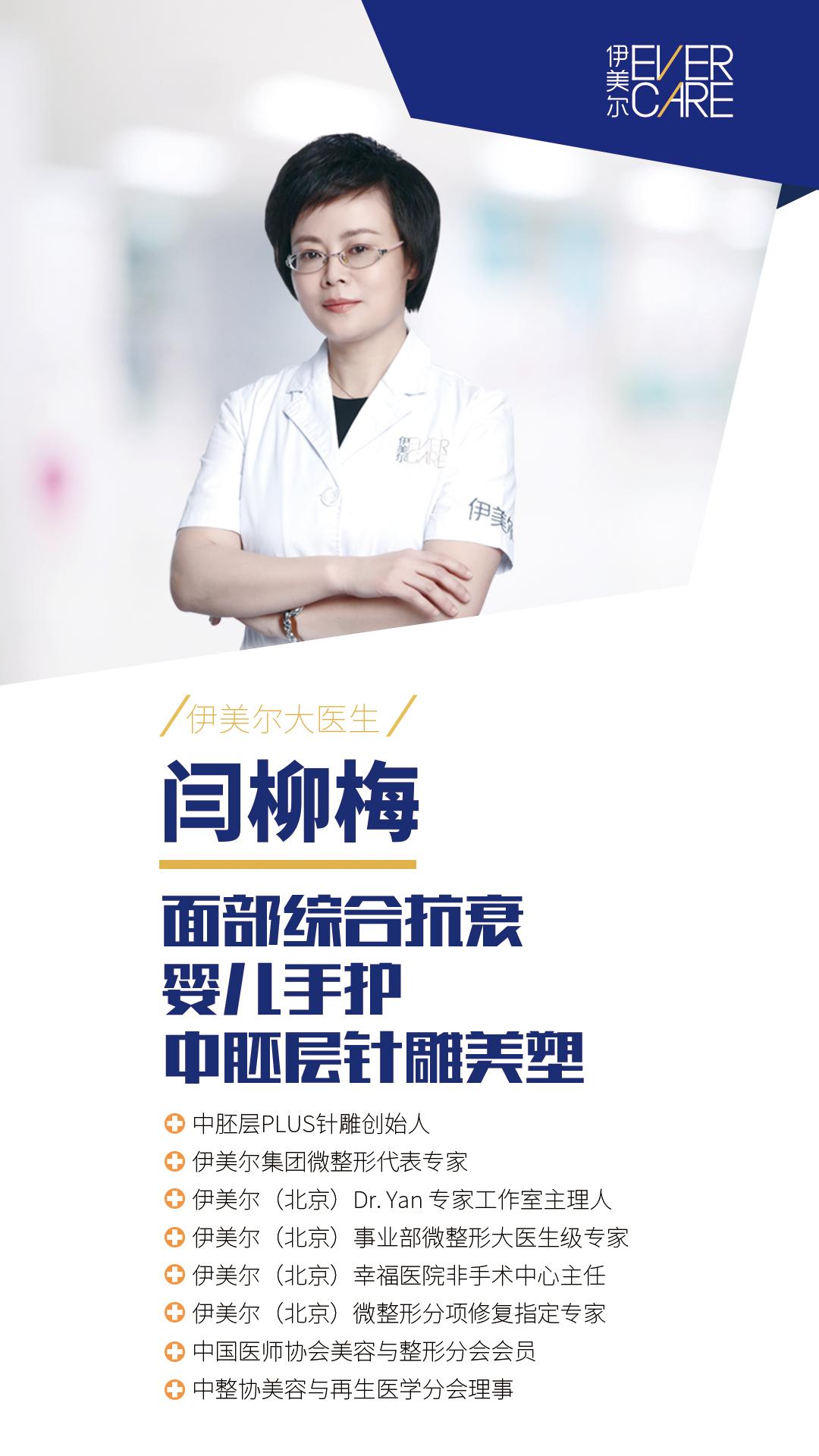闫柳梅主任师从欧洲整容协会主席、爱贝芙之父Lenperle教授,将面部精塑的理念带入中国。她曾荣获众多业界荣誉,被电视、杂志等众多媒体关注报道。具备20余年皮肤科及医疗美容临床经验,曾在北京多家三甲医院进修深造,具有丰富的医学美容专业知识,资历深厚,拥有上万操作案例,技术精湛,在面雕和抗衰方面具有独特的前瞻性美学理念修养,善于将时尚融入到个性化设计方案中,独创的“三维立体注射法”受到业界的高度肯定以及求美者的赞不绝口。