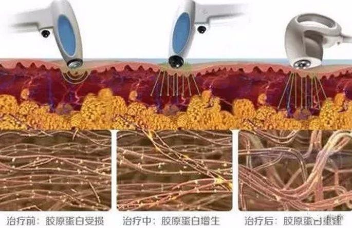 射频紧肤主要通过在皮下特定深度内产生特定的射频场,刺激胶原蛋白及弹性纤维的增生重组,达到收紧皮肤的作用。