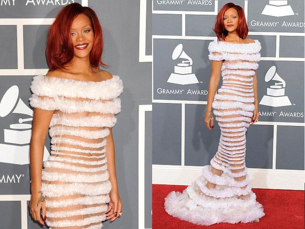 歌手蕾哈娜是一个选择离谱的出席红毯礼服大户。她在2011格莱美颁奖典礼的服装结合了镶板与白色荷叶边的迷人果。在2014年CFDA奖,蕾哈娜把她的红地毯理念更进一步,她充分展示乳房下的施华洛世奇水晶的网格。