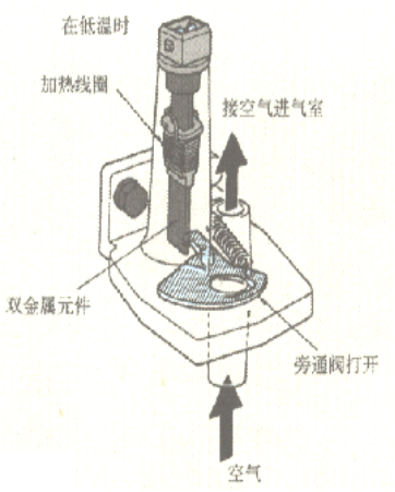 双金属片式旁通空气控制阀是用来控制发动机在冷起动和暖机过程中的附加空气量,进而调整发动机的转速。