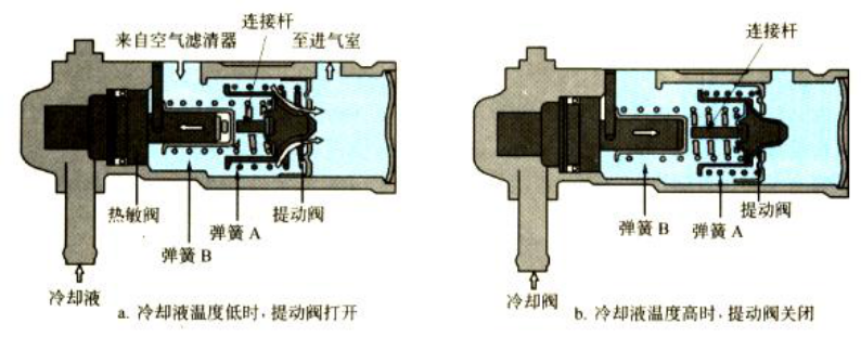 它通过密封于阀内部热敏石蜡的热胀冷缩推动连接杆使提动阀动作,改变空气通道,控制旁通气量。