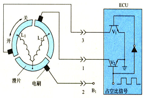 当占空比小于50%时,线圈L1的平均通电时间长,T1>T2,电枢带动旋转滑阀逆时针偏转,空气旁通道截面增大,怠速升高。