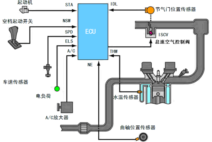 电气负载增多时的怠速控制 :在怠速运转时,如使用的电气负载增大(比如打开大灯),蓄电池电压就会降低。此时提高怠速,增大发电机发电量。
