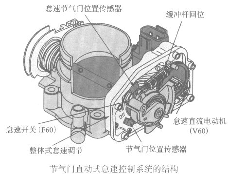 节气门直动式怠速控制系统主要由节气门位置传感器、怠速节气门位置传感器,怠速开关和执行器(怠速直流电动机)以及一套齿轮驱动机构组成
