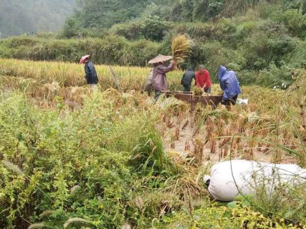 抢收割。香坝镇有种植水稻1600余亩,秋天稻谷熟了,然而持续的降雨天气,给群众收割水稻带来很多不便。为了能够让群众及时把水稻收割完成,香坝镇采取每天发送天气预报消息,由各村(社区)村支两委和驻村工作队成员及时反馈给群众,群众根据天气情况合理安排收割时间,水稻能够及时收割进家。在南坝村,有种植水稻600余亩,一片片坐落有序的梯田,给南坝村穿上了一件金黄色的外衣。在这种多雨的天气中也没有能够阻止群众对产业的抢收,稻田里,有机器发出的隆隆声,有人工收割时带有节奏感的拍打声,声音悦耳,气氛和谐温馨,目前全镇水稻收割已经接近尾声。
