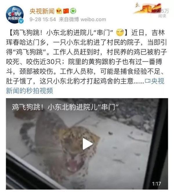 今年9月26日,一只野生东北豹突然造访了吉林珲春哈达门乡东方红村,咬死咬伤近30只鸡,一位村民房前一只看门护院的黄狗在和豹子争斗中颈部被咬伤。珲春东北虎保护局马滴达保护站工作人员不久便赶到现场,并用烟雾将这只东北豹驱赶回山林。珲春东北虎保护局科研监测中心主任郎建民判断,这是一只刚离开母体的亚成体东北豹,可能是由于捕食经验不足导致饥饿或者出于对猎物的好奇才进了村。