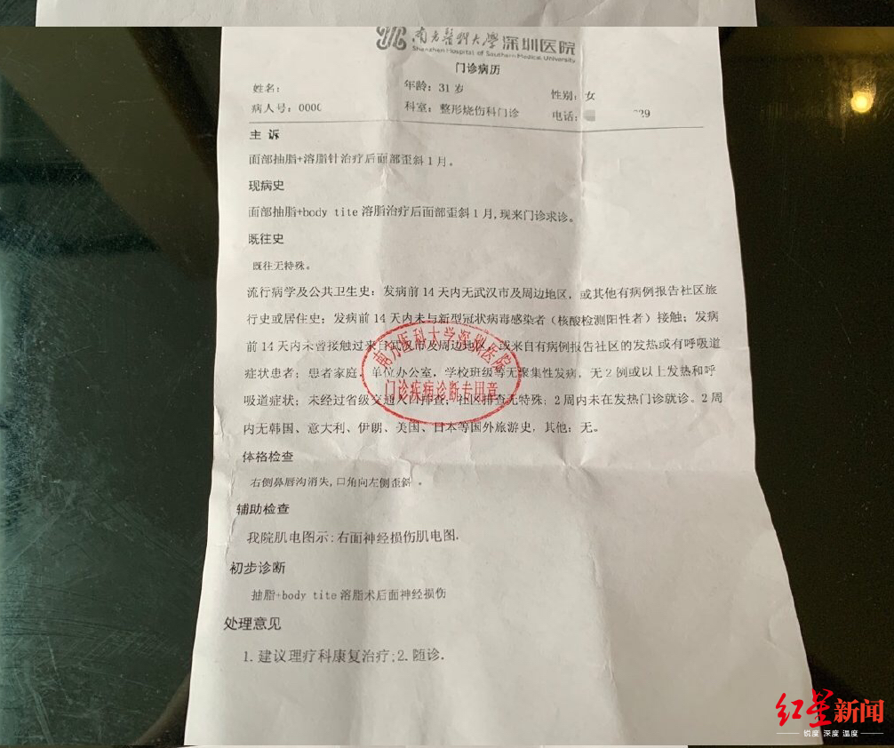 深圳女子做面部吸脂术后“面瘫”