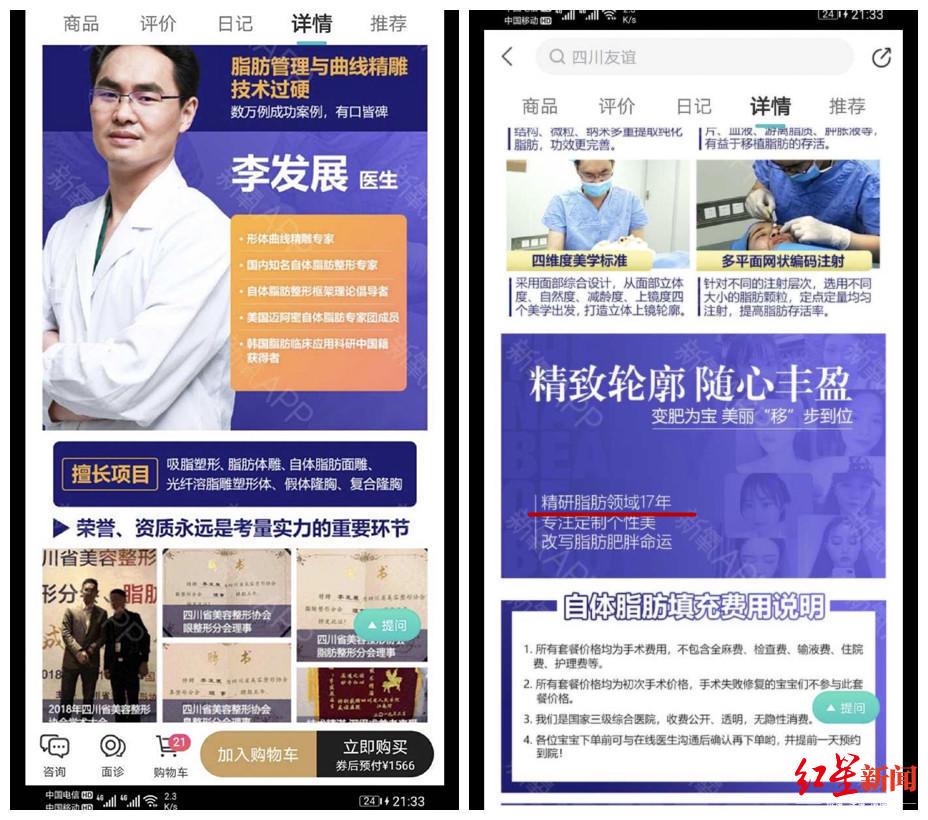 5月6日,红星新闻记者在网上对四川友谊医院其他宣传平台进行搜索发现,李发展医生的相关介绍以及资质资料已经没有了,而在吸脂项目中显示有“四川友谊专家团”医生集体照片,里面还有李发展医生。