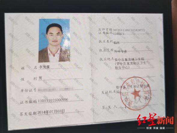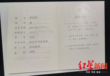 红星新闻记者调查发现,网上的公开资料显示,李发展毕业于内江市卫生学校,专业为社区医学,类别为临床,其医师资格证于2013年12月取得。另外,他的医师执业证签发时间为2014年7月,执业范围为外科专业,执业地点为资中县重龙镇卫生院。随后在2016年3月,其执业地点变更到一家民营医院,2019年3月又变更为四川友谊医院。