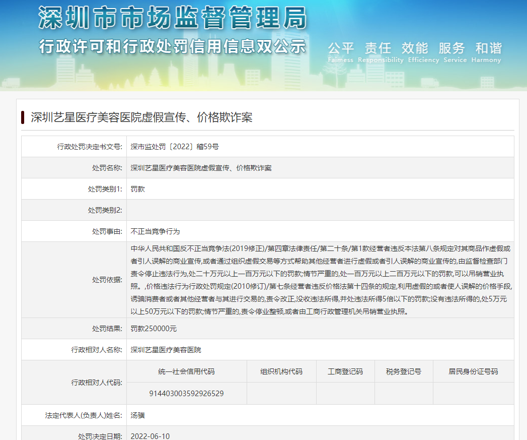 6月10日,深市监处罚〔2022〕稽59号行政处罚决定书显示,深圳艺星医疗美容医院因虚假宣传、价格欺诈,被深圳市市场监督管理局罚款25万元。处罚依据显示,《反不正当竞争法(2019修正)》第四章第二十条第1款,经营者违反本法第八条规定对其商品作虚假或者引人误解的商业宣传,或者通过组织虚假交易等方式帮助其他经营者进行虚假或者引人误解的商业宣传的,由监督检查部门责令停止违法行为,处二十万元以上一百万元以下的罚款;情节严重的,处一百万元以上二百万元以下的罚款,可以吊销营业执照。另外,《价格违法行为行政处罚规定(2010修订)》第七条规定,经营者违反《价格法》第十四条的规定,利用虚假的或者使人误解的价格手段,诱骗消费者或者其他经营者与其进行交易的,责令改正,没收违法所得,并处违法所得5倍以下的罚款;没有违法所得的,处5万元以上50万元以下的罚款;情节严重的,责令停业整顿,或者由工商行政管理吊销营业执照。