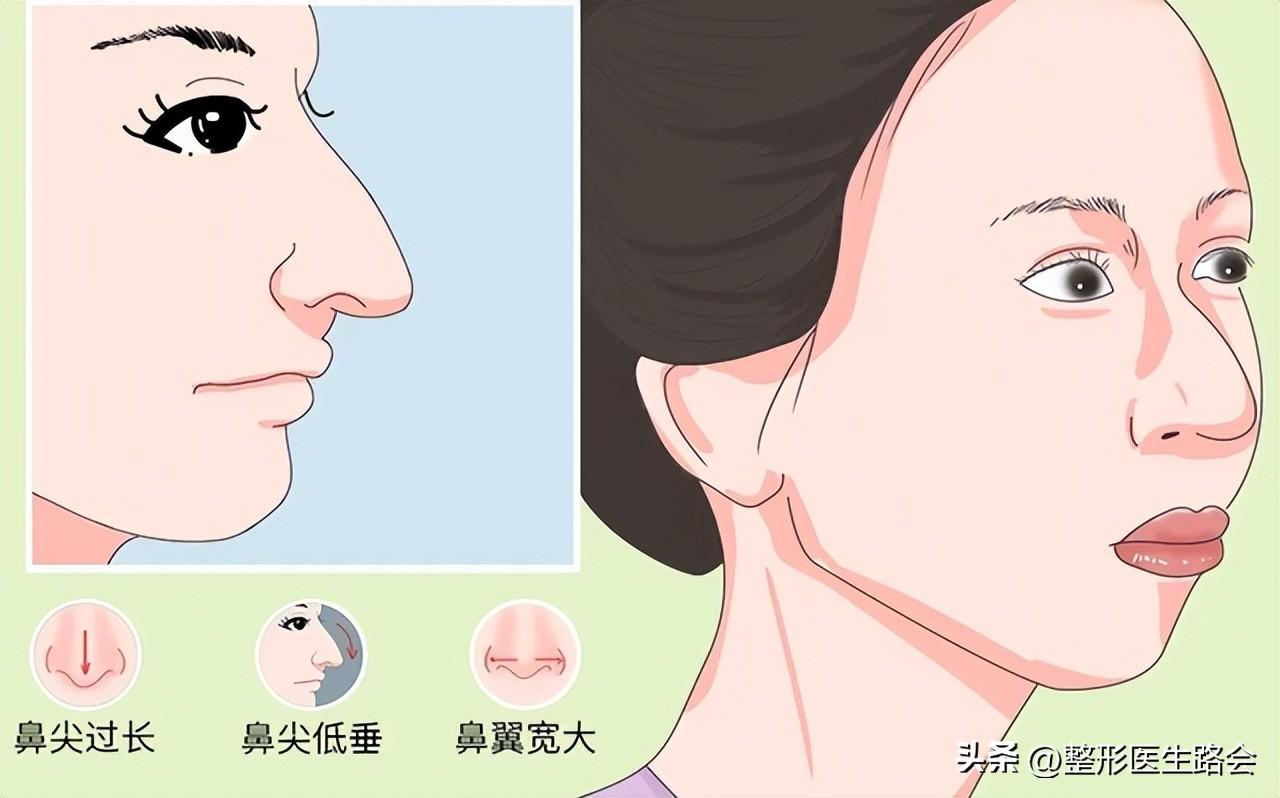 鼻子多数表现为过长,像鹰的鸟嘴一样往下长,并伴随着向下的旋转。并且所谓的海鸥线过于突出,导致侧面鼻孔、侧方黑影短经距离大于10毫米。