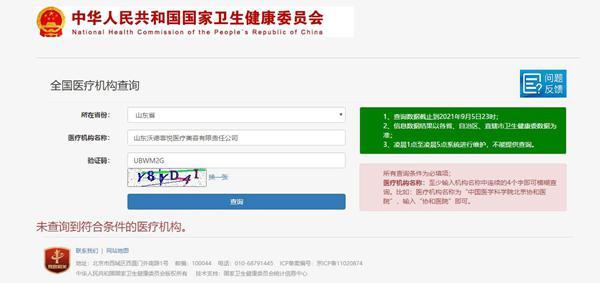 山东沃德喜悦医疗美容有限责任公司是否取得了《医疗机构执业许可证》呢,就此问题,记者也咨询了济南高新区社会事务局,该局工作人员回复称,具体是否具有《医疗机构执业许可证》可通过山东省卫健委官网进行查。随后记者进行了查询,系统提示未查询到符合条件的医疗机构。