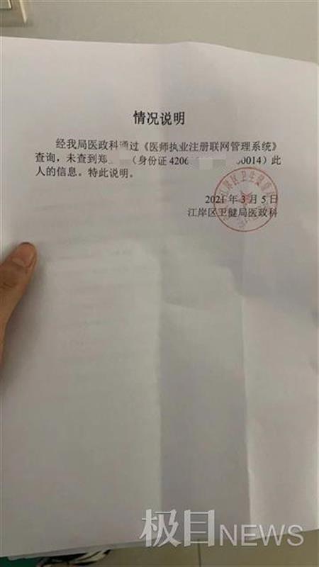 经查询,江岸区卫健委医政科称,通过医师执业注册联网管理系统,该科通过郑某身份证号信息,未查到郑某的信息。目前,他们正对此事作进一步调查处理。