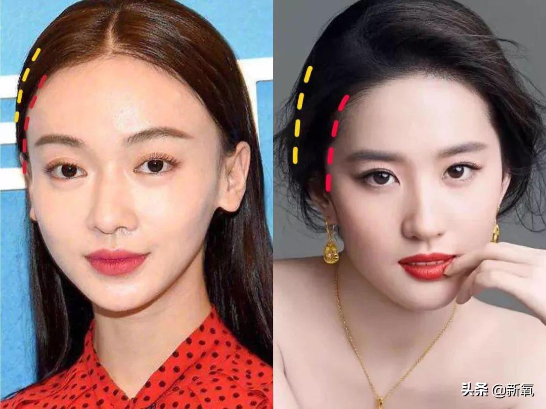 高颅顶+颞部宽,是一种幸运搭配。在没有颧弓外扩的情况下,这类组合通常改良一下发际线就能为整体加分不少。比如赵丽颖调整一下发际线,额头和颞部立马很饱满,整体轮廓的流畅度也提升不少。