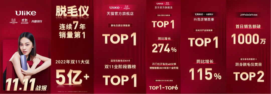 这几年在借势流量东风、完成线上种草后,Ulike又持续通过霸屏分众,穿越了流量红利见顶的掣肘期,成功从网红品牌破圈为公众品牌。今年双11,Ulike销量成功破5亿,市占率超70%,稳坐脱毛仪品类宝座。