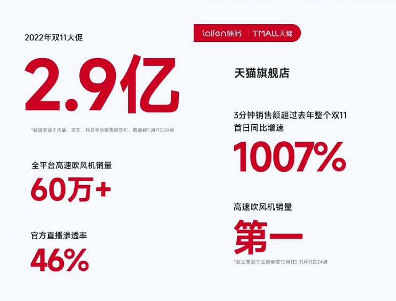 数据显示,徕芬今年在天猫双11预售期热卖、加购、热销榜单均居前三,3分钟销售即超过去年整个双11,京东10月31日首日开门红活动同比增速938%。