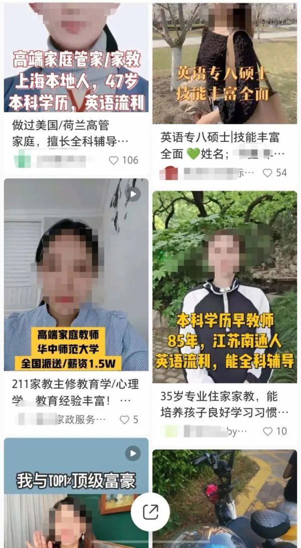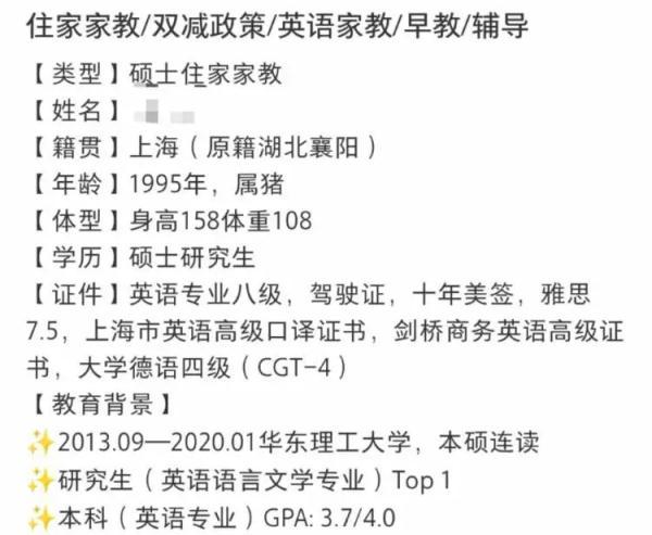 仔细一看,“985毕业、”“硕士”、“英语八级”、“海归”、“教师资格证”……一个个漂亮的标签暗示着,这些工作实质上就是家教、住家教师。