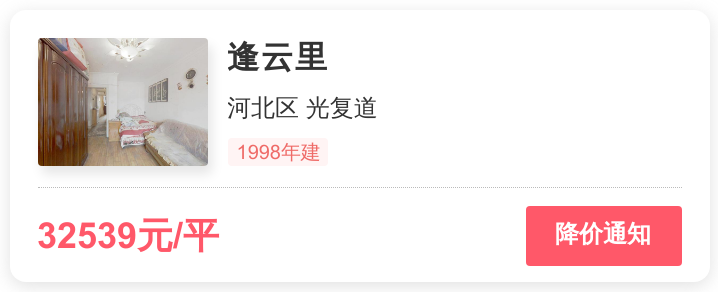 房价行情2020年6月为止,小区挂牌均价为32539元/平方米,高出光复道均价(3.03万/㎡)2246元,高出河北区均价(2.49万/㎡)7598元。小区均价偏高。
