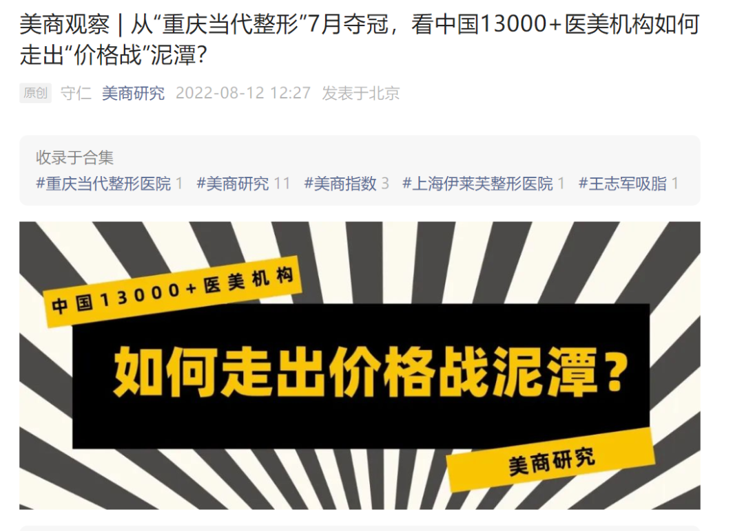 如美商研究此前发布的文章《从“重庆当代整形”7月夺冠,看中国13000+医美机构如何走出“价格战”泥潭?》所介绍,在其他地区医美机构还在为获取更多新客流量而深陷价格战泥潭,无限“内卷”之时,重庆当代整形已经开始注重品牌IP搭建,不仅走出了内耗的价格战泥潭,更实现了产品溢价。