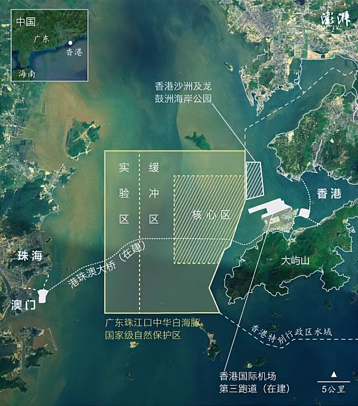 图5 广东珠江口中华白海豚自然保护区示意图(2016),时值港珠澳大桥建设之际,可见大桥选址穿越了实验区、缓冲区乃至核心区 | 图源[17]