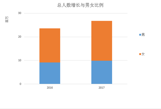 2017年,全国范围内关注医疗美容的群体总人数已超过2678万,同比去年增加了13.57%,相比于增长缓慢的男性群体,女性涨幅较大,为17.1%。从性别上看,女性仍然是国内医疗美容消费群体的主力,然而男性整形用户未来的增长潜力也不容小觑。