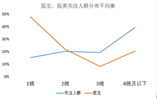 17年关注医美群体中,坐标三四线城市的人群占总人数的60%左右,需求量巨大,而医生则主要分布在一二线城市,资源分配严重不平衡。三四线城市关注医美的群体需求无法得到充分满足。
