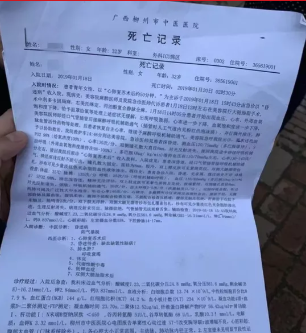 1月18日,柳州32岁的李女士来到柳州鑫银艾米莉医疗美容门诊部(简称鑫艾门诊)做吸脂隆胸手术时,心脏骤停,1月20日凌晨经抢救无身亡。