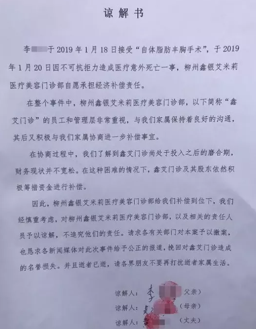 李女士“于1月18日接受‘自体脂肪丰胸手术’,于1月20日因不可抗拒力造成医疗意外死亡一事,鑫银门诊自愿承担经济补偿责任”。