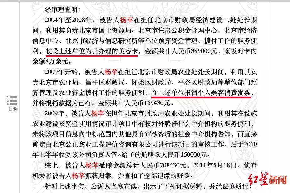 红星新闻记者检索到,中国裁判文书网公布了杨苹受贿案的刑事判决。法院审理查明,杨苹受贿总额为70.8万余元。其中大部分是“美容腐败”的涉案款物。