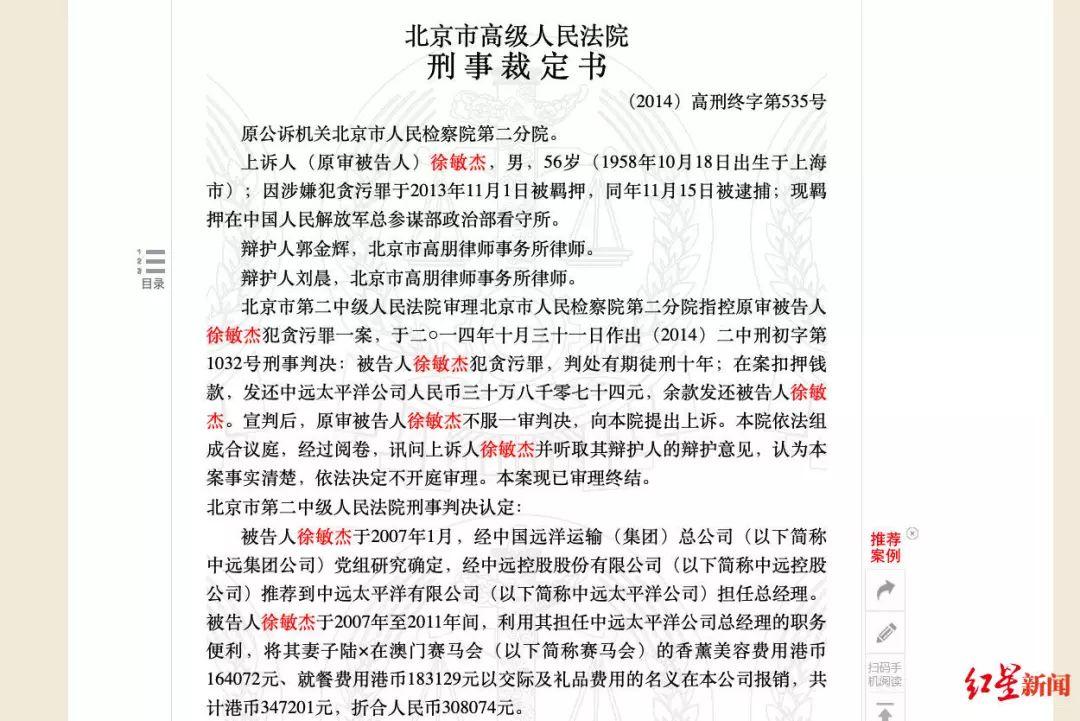 北京高院的刑事裁定书显示,1958年出生的徐敏杰,在2007年便出任中远太平洋有限公司总经理。然而,从2007年至2011年间,徐敏杰利用其担任中远太平洋公司总经理的职务便利,将其妻子在澳门赛马会的香薰美容费用港币16.4万余元等费用,在本公司报销。