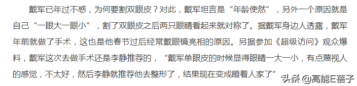 后来他与李静一同参加真人秀《青春旅社》,李静还谈及此事,李静表示因为自己变胖了,录节目的时候要求镜头往上移,结果这样操作就把单眼皮的戴军眼睛拍得很小。为了上镜需要,于是李静就给戴军找了个整容医生做双眼皮。结果,做失败了。