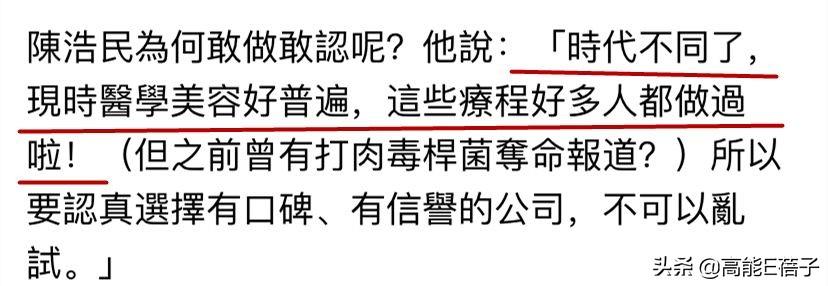 当港媒问及陈浩民为何敢勇于承认时,陈浩民笑言,时代不同,医美已经很普遍,没必要撒谎。但同时他也建议如果真要医美,一定要选择有口碑有信誉的公司。