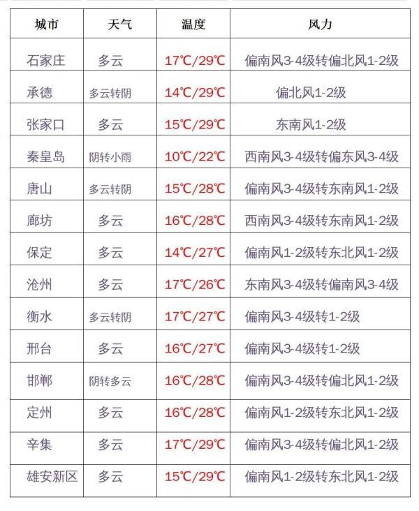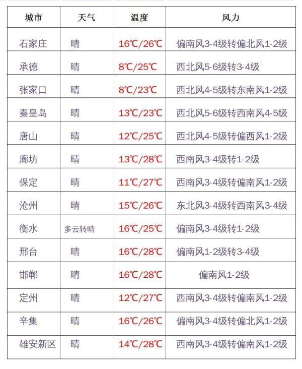明天白天,邢台、邯郸晴转多云,其他地区晴间多云。