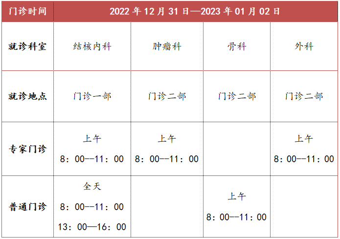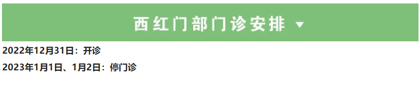 2022年12月31日(星期六)、2023年1月2日(星期一),医院上午半天门诊,儿科全天门诊;