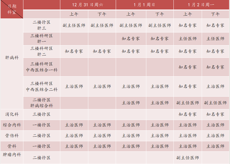【肝病与肿瘤介入调节中心门诊】:1月 1日上午有专家门诊,其余时间停诊。